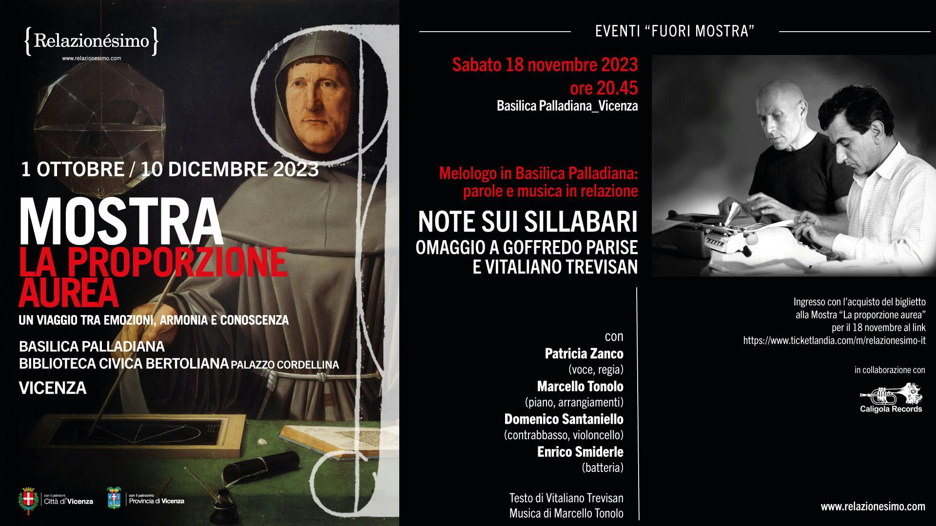 Ad arricchire la programmazione degli eventi collaterali alla mostra “La Proporzione Aurea”, allestita nella prestigiosa sede della Basilica Palladiana fino al 10 dicembre 2023, si affianca uno speciale spettacolo teatrale dedicato ai Sillabari di Goffredo Parise e riletto attraverso le parole di Vitaliano Trevisan.