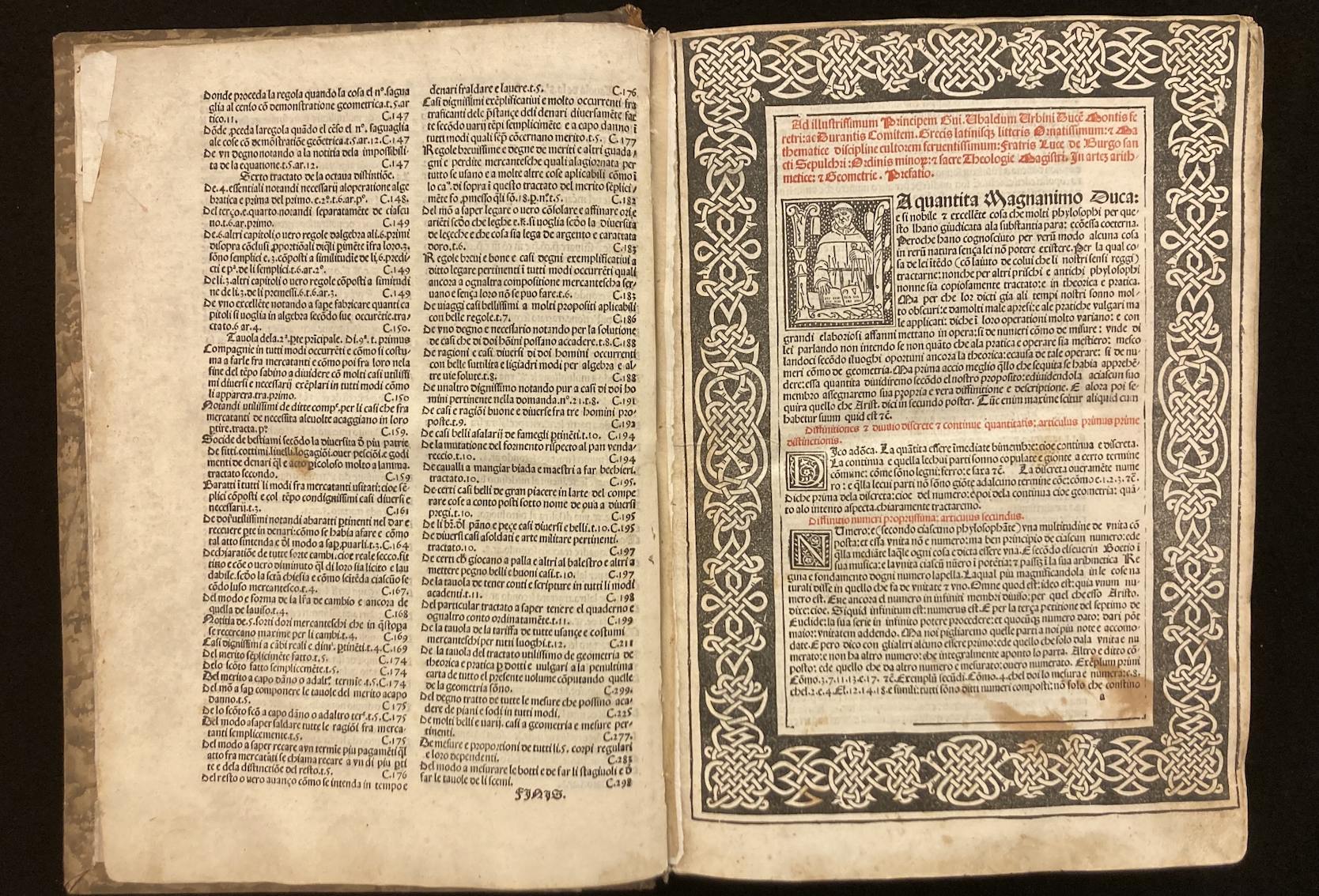 Tra le opere esposte per la mostra La proporzione aurea, aperta fino al 10 dicembre prossimo, spicca la "Summa de aritmetica" di Luca Pacioli, un testo capitale per la storia della matematica.